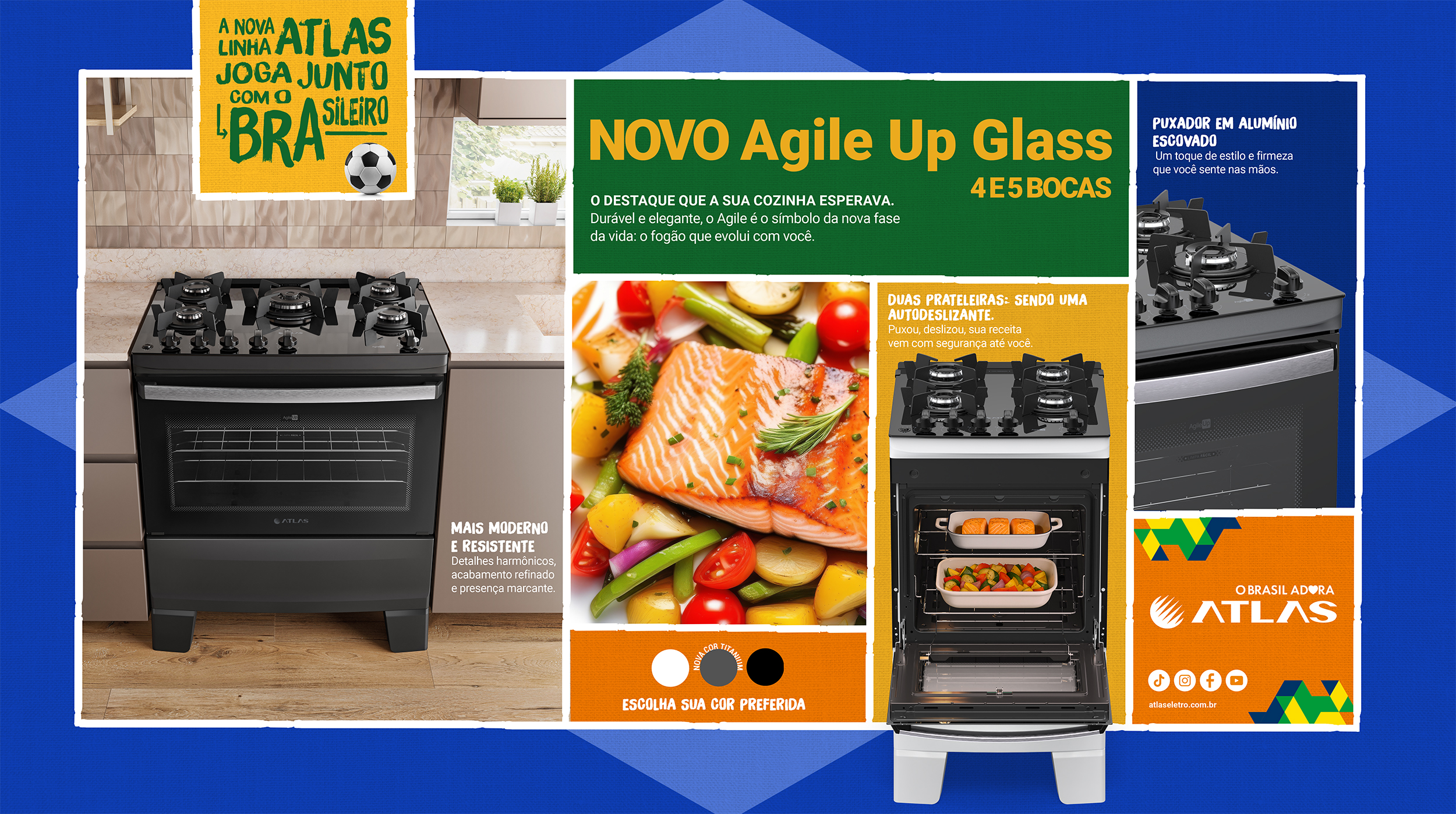 Com design elegante e contemporâneo, o Agile Up Glass traz linhas harmônicas e acabamento refinado que valorizam o ambiente. O puxador em alumínio escovado adiciona firmeza e sofisticação, enquanto os queimadores maiores e reforçados garantem agilidade e durabilidade.