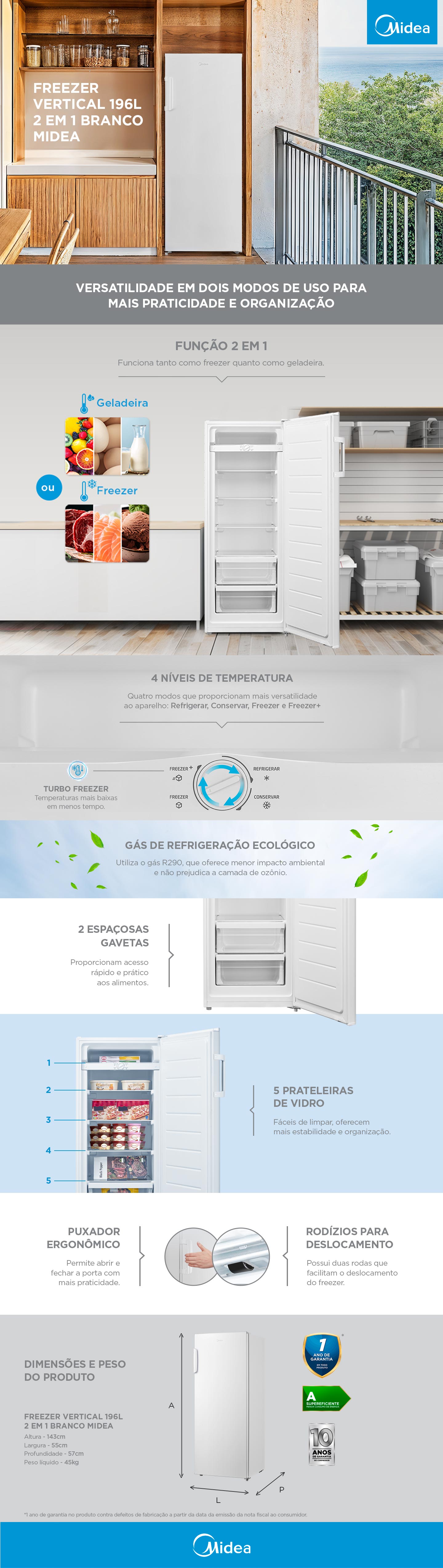 O Freezer Vertical 196L 2 em 1 Branco Midea é ideal para quem precisa de praticidade e versatilidade no dia a dia. Ele funciona como geladeira no modo refrigerar e como freezer nos modos Conservar e Freezer (Turbo Freezer).