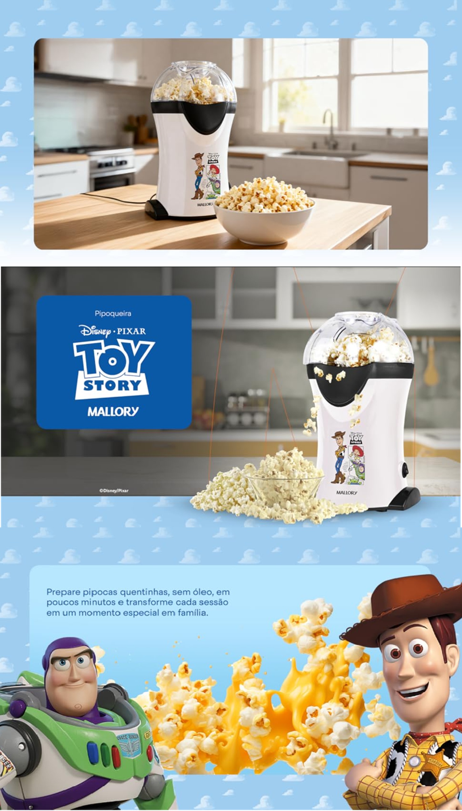 A Pipoqueira Toy Story da Mallory é perfeita para quem deseja pipocas sequinhas e sem óleo, com a praticidade de um preparo rápido e sem complicação. Seu bocal expedidor permite que as pipocas caiam diretamente na tigela, tornando a experiência ainda mais limpa e prática.